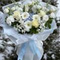 Bring elegance and freshness to any occasion with this delicate pastel bouquet in soft blue and white tones. The arrangement features premium blue hydrangeas, white gerberas, spray roses, chrysanthemums, and lisianthus, beautifully wrapped in sky-blue designer paper and finished with a matching satin ribbon.