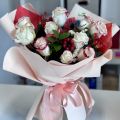 Delight in the delicate beauty of our Blush Elegance Bouquet, a charming arrangement perfect for expressing love, gratitude, or gentle affection. This hand-tied bouquet features elegant white roses with soft pink-tipped petals, nestled among rich greenery, vibrant red hypericum berries, and touches of unique blue eryngium. Wrapped in luxurious blush-toned paper and finished with a wide satin ribbon, this bouquet is both modern and romantic — ideal for birthdays, anniversaries, or simply to brighten someone's day.