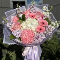 A charming pastel bouquet that captures the essence of tenderness and joy. Featuring pink roses, lilac stock, white hydrangea, and cheerful gerberas, this arrangement blends shades of blush, lavender, and cream for a soft, elegant look. Perfect for birthdays, thank-you gifts, or romantic surprises, each bouquet is hand-tied and beautifully wrapped in lilac paper and satin ribbons.