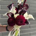 A striking and elegant bridal bouquet designed in rich burgundy and ivory tones. This sophisticated arrangement features premium calla lilies, dahlias, chrysanthemums, and textured amaranthus, creating a dramatic yet refined look.