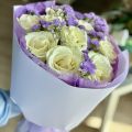 Indulge in the timeless elegance of our exquisite bouquet, where delicate ivory roses bloom in perfect harmony with enchanting purple statice. Wrapped in soft lavender hues and adorned with a graceful satin ribbon, this arrangement exudes sophistication and charm. Whether it’s a heartfelt gift or a stunning centerpiece, this bouquet is a true expression of beauty and grace. Let your emotions blossom with this captivating floral masterpiece!