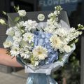 Elegant and refreshing, Snow Petal is a graceful bouquet of crisp white blooms with soft blue accents. Featuring pure white gerberas, lisianthus, snapdragons or Mathiola, chrysanthemum, and blue hydrangea, this bouquet radiates peace and light. Wrapped in pastel blue paper and finished with satin ribbons, it's the perfect gift for occasions that call for serenity and beauty.