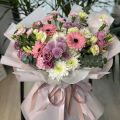 Soft Harmony is a delicate and joyful bouquet featuring a beautiful mix of pastel flowers in soft pink, lavender, cream, and white tones. Pink gerbera daisies take center stage, complemented by lisianthus, chrysanthemums, carnations, eucalyptus, and seasonal greenery. Wrapped in elegant blush and white paper and finished with a soft satin ribbon, this bouquet feels light, fresh, and effortlessly elegant.