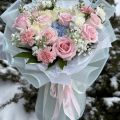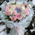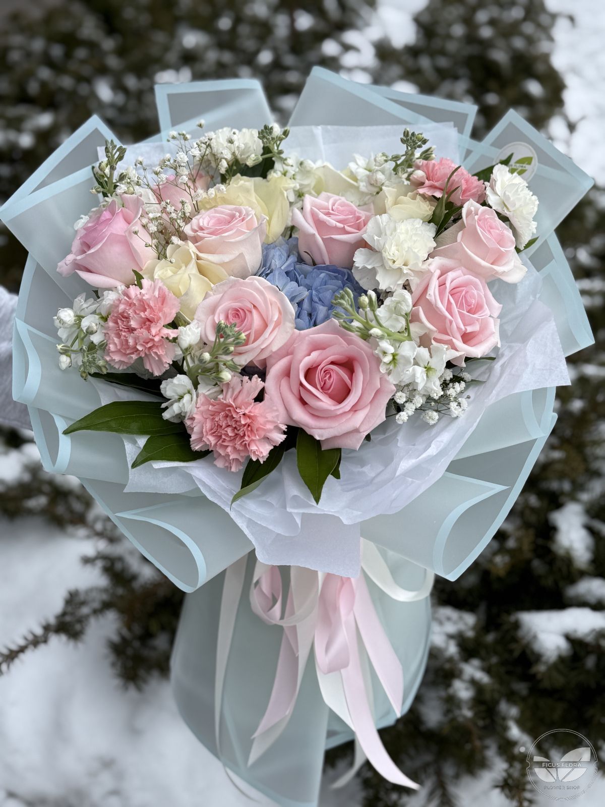 Wrapped in elegant pastel blue and white paper and finished with soft pink ribbons, Blue Whisper is designed to convey tenderness, care, and refined beauty. Handcrafted by our florists at Ficus Flora Flower Shop, this bouquet is ideal for meaningful moments and heartfelt gifting.