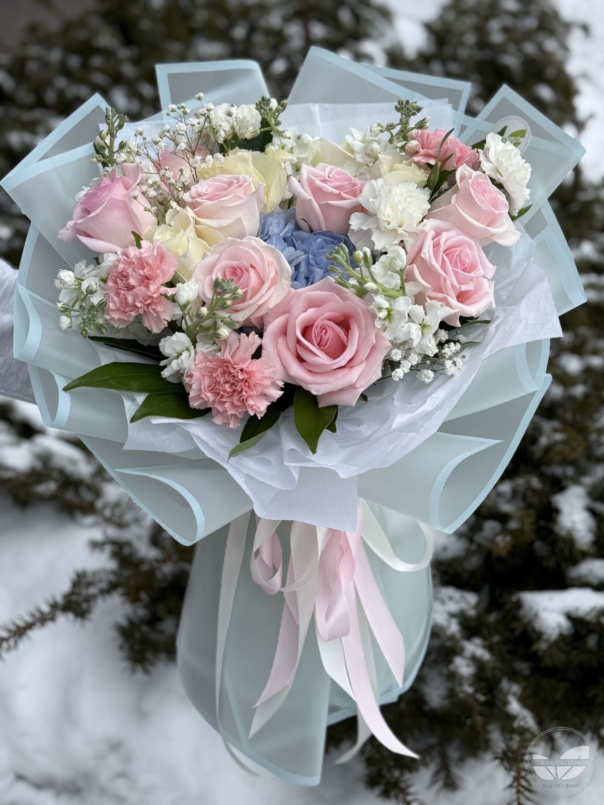 Blue Whisper is a soft, romantic bouquet featuring delicate blush pink roses arranged around a gentle blue hydrangea centerpiece. Complemented by creamy white roses, pink carnations, baby’s breath, and seasonal filler flowers, this arrangement feels airy, graceful, and perfectly balanced.