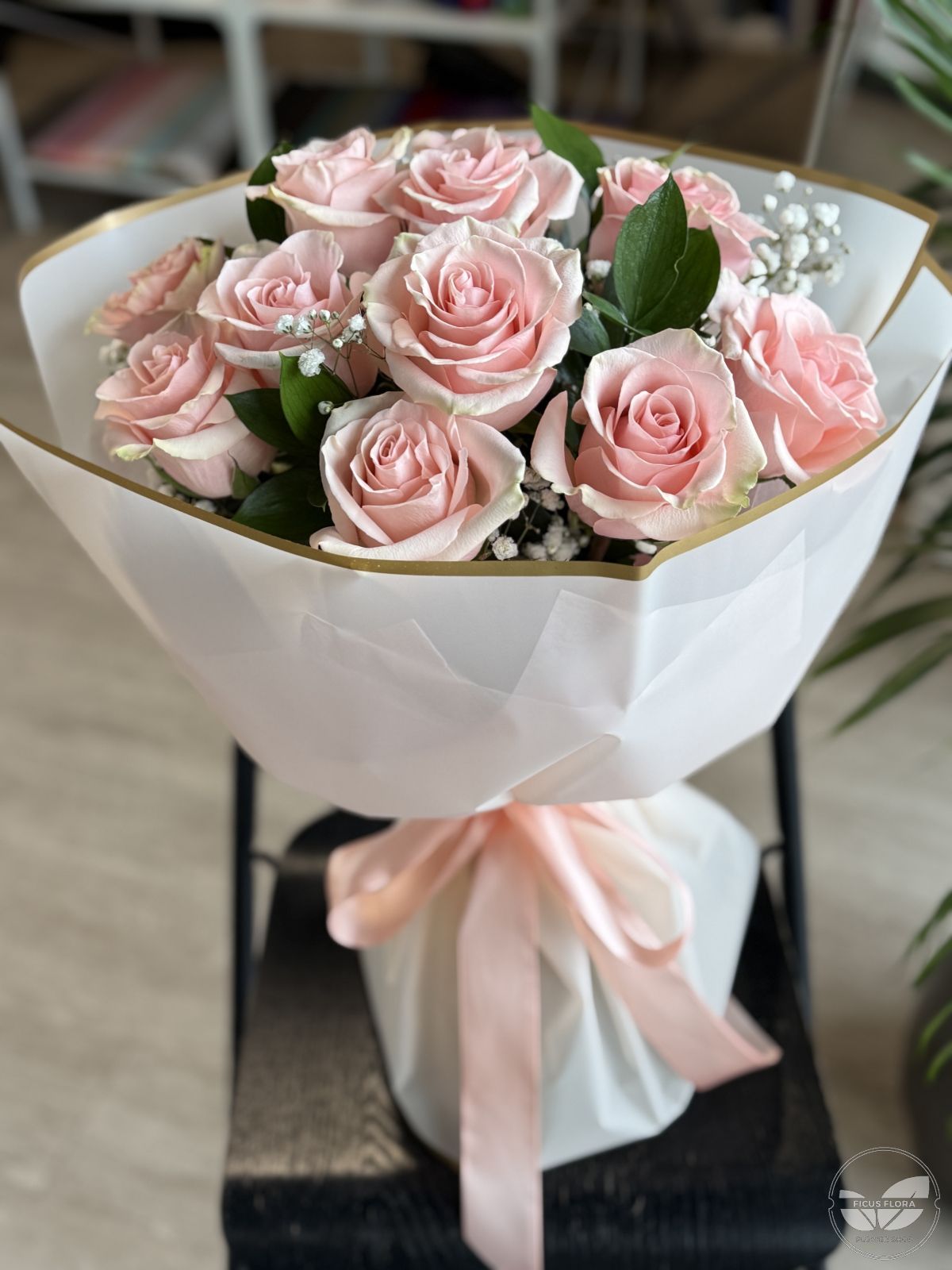 A delicate bouquet of soft pink roses, accented with sprigs of baby’s breath and tropical greenery. Wrapped in pastel paper and tied with an elegant ribbon, this romantic arrangement radiates grace and gentle charm. Perfect for expressing love, appreciation, or simply brightening someone’s day.