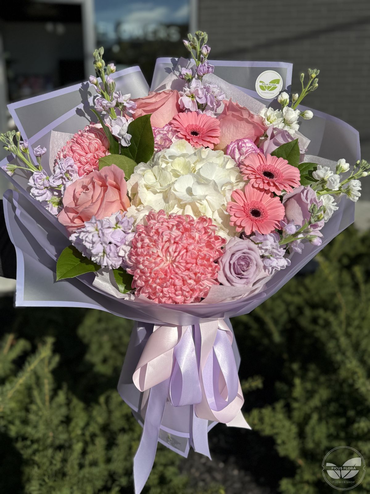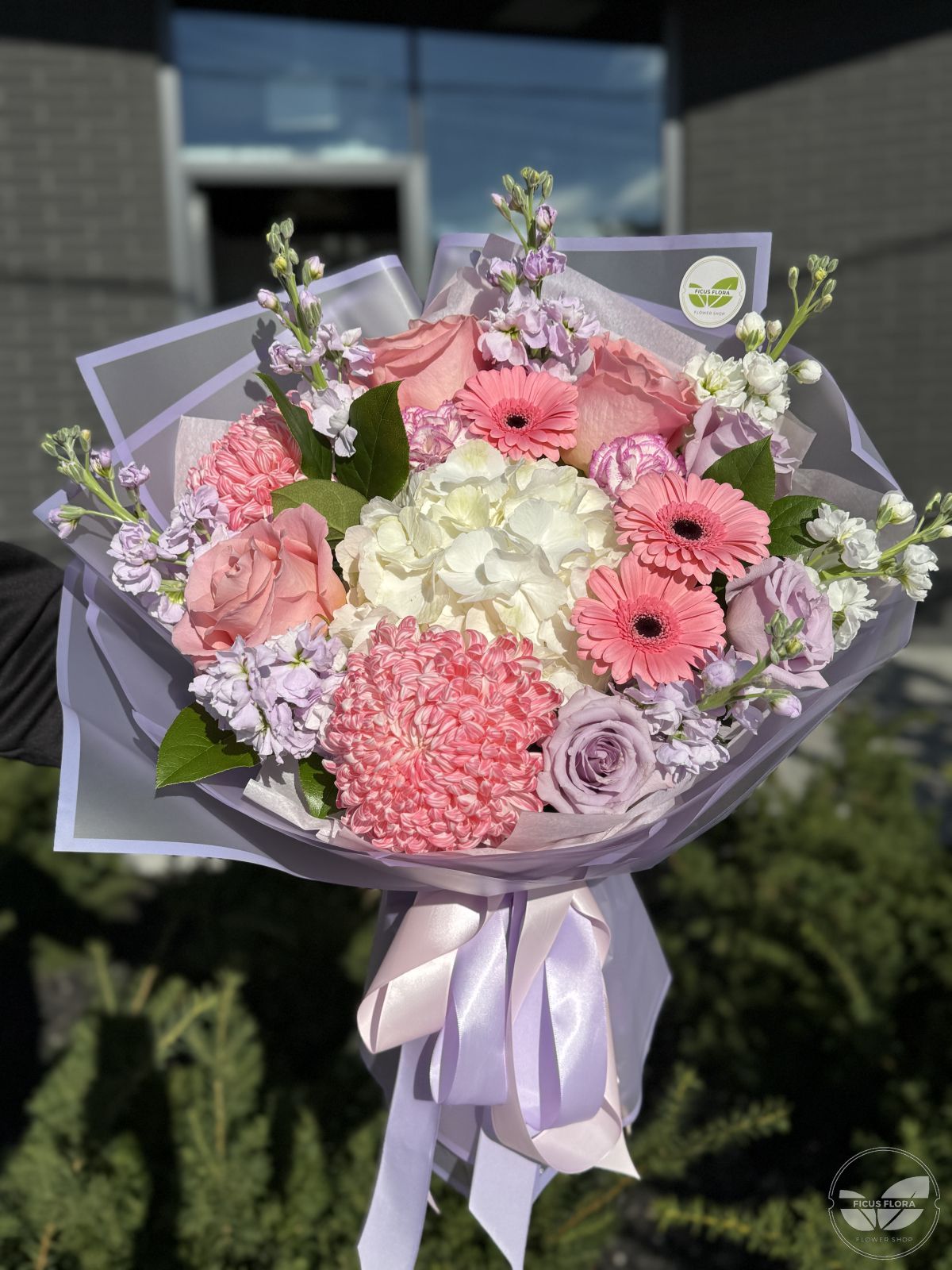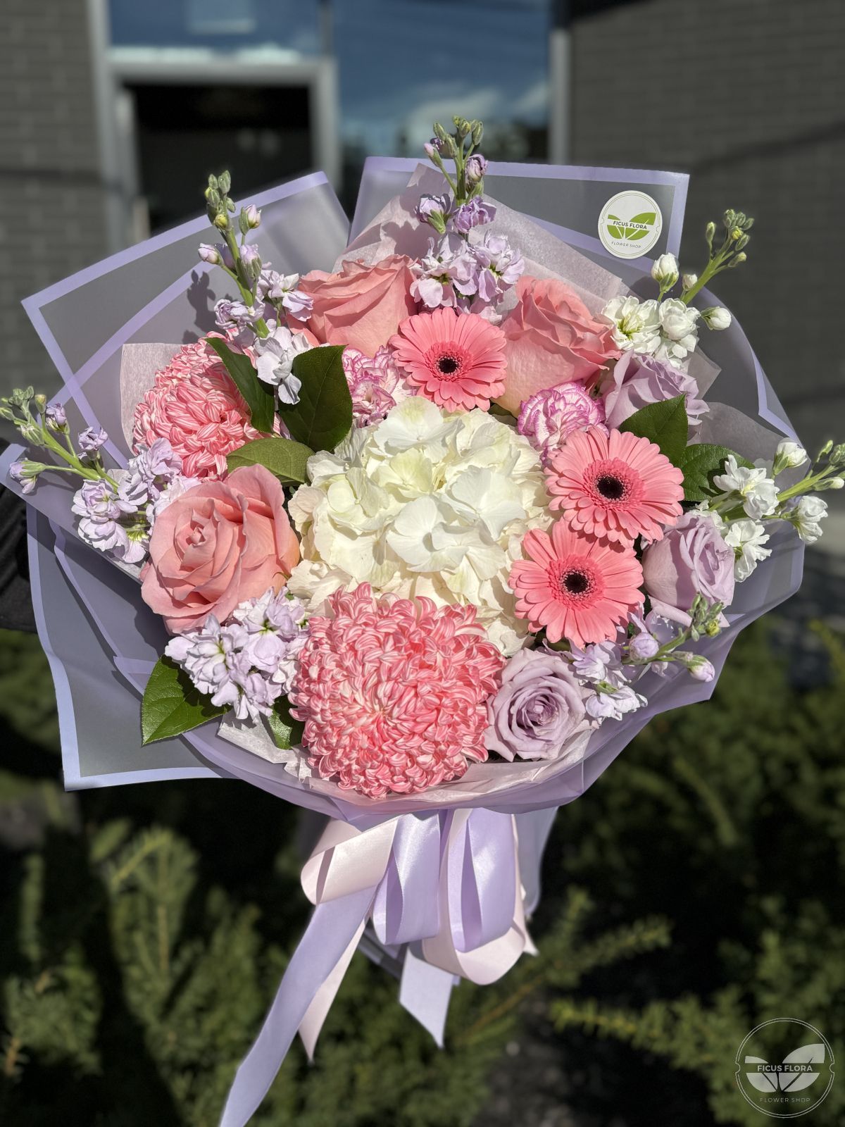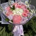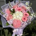 A charming pastel bouquet that captures the essence of tenderness and joy. Featuring pink roses, lilac stock, white hydrangea, and cheerful gerberas, this arrangement blends shades of blush, lavender, and cream for a soft, elegant look. Perfect for birthdays, thank-you gifts, or romantic surprises, each bouquet is hand-tied and beautifully wrapped in lilac paper and satin ribbons.