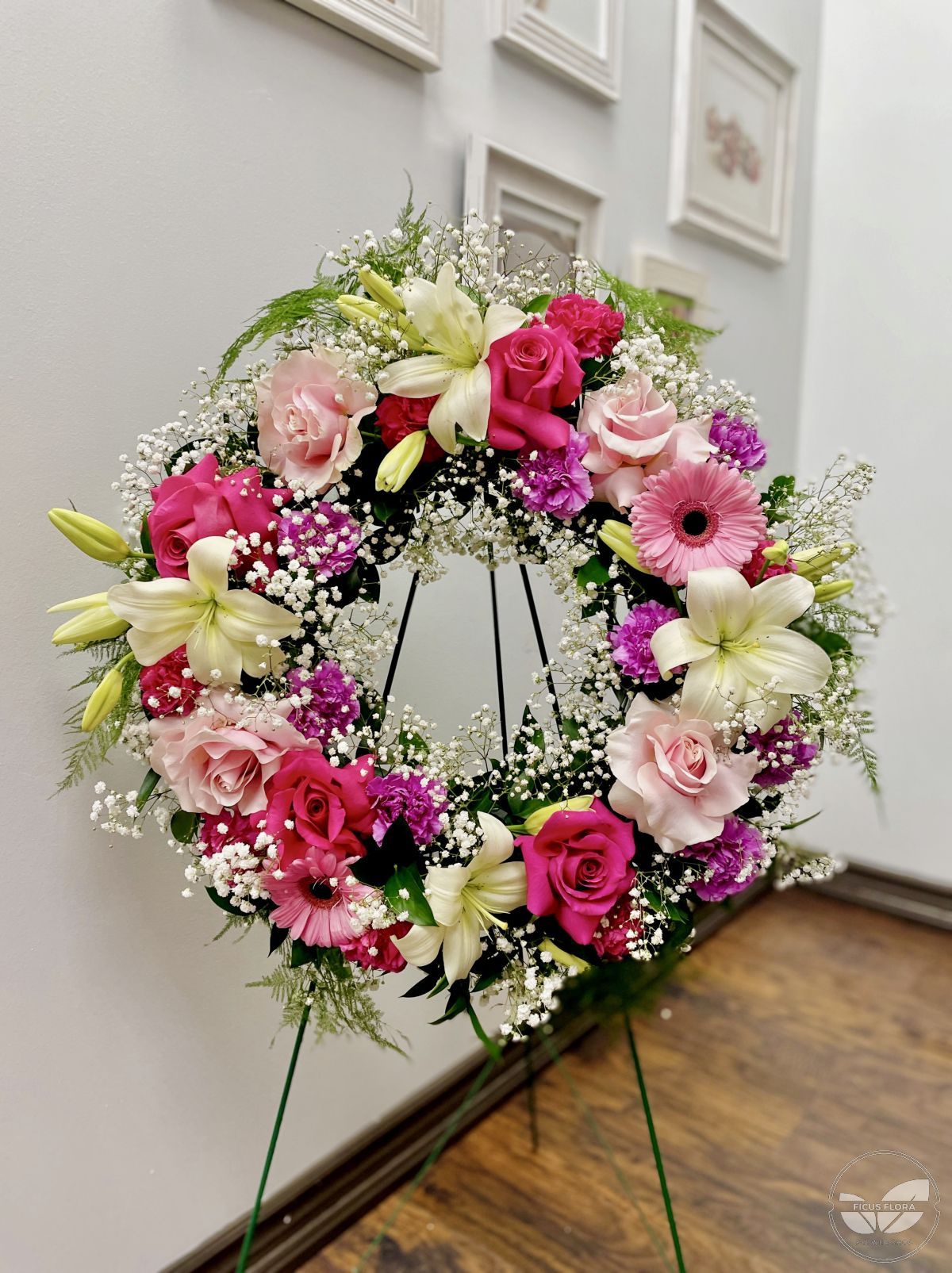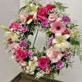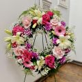 A heartfelt tribute full of color, beauty, and grace — this elegant funeral wreath is designed to honor a life filled with love and light. Featuring a harmonious blend of soft blush roses, vibrant fuchsia blooms, creamy lilies, and delicate baby’s breath, this circular arrangement symbolizes eternity and everlasting remembrance. Touches of greenery add natural elegance, while the bright yet gentle palette brings comfort and peace during a time of loss. Perfect for expressing deep sympathy and celebrating a beautiful soul who brought color into the lives of others.