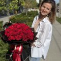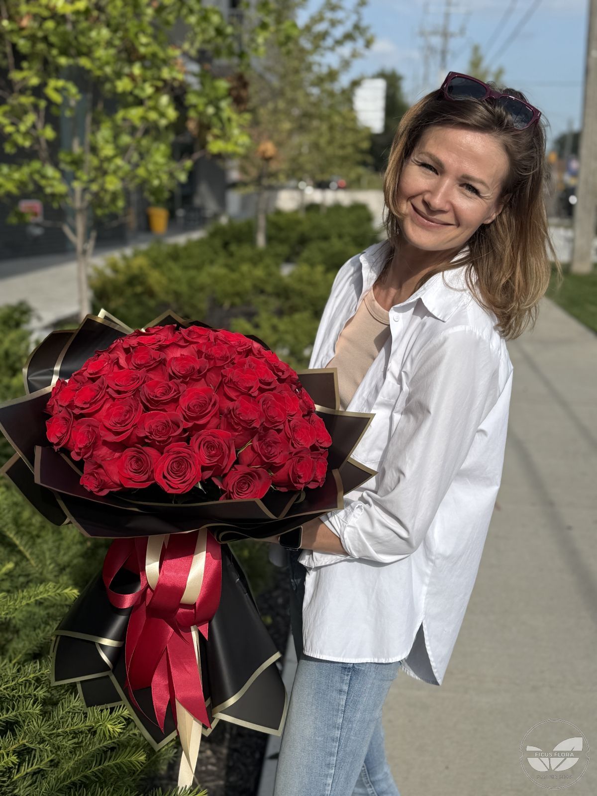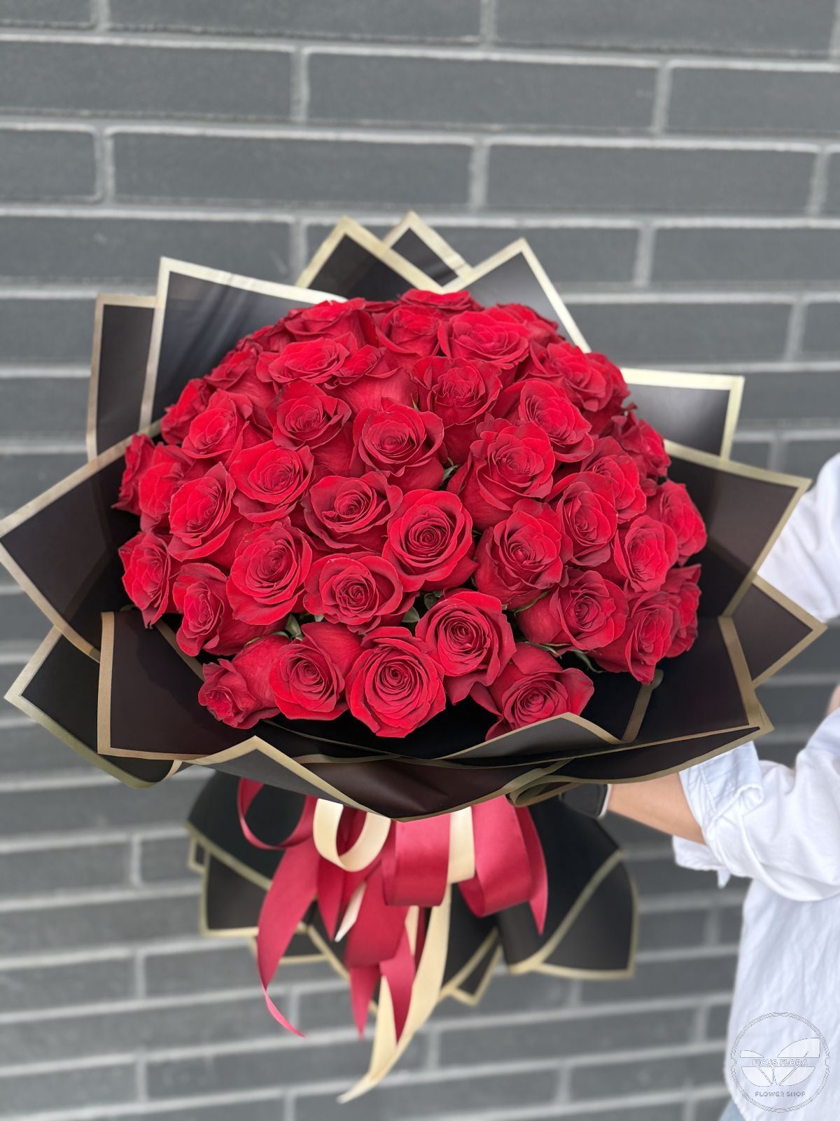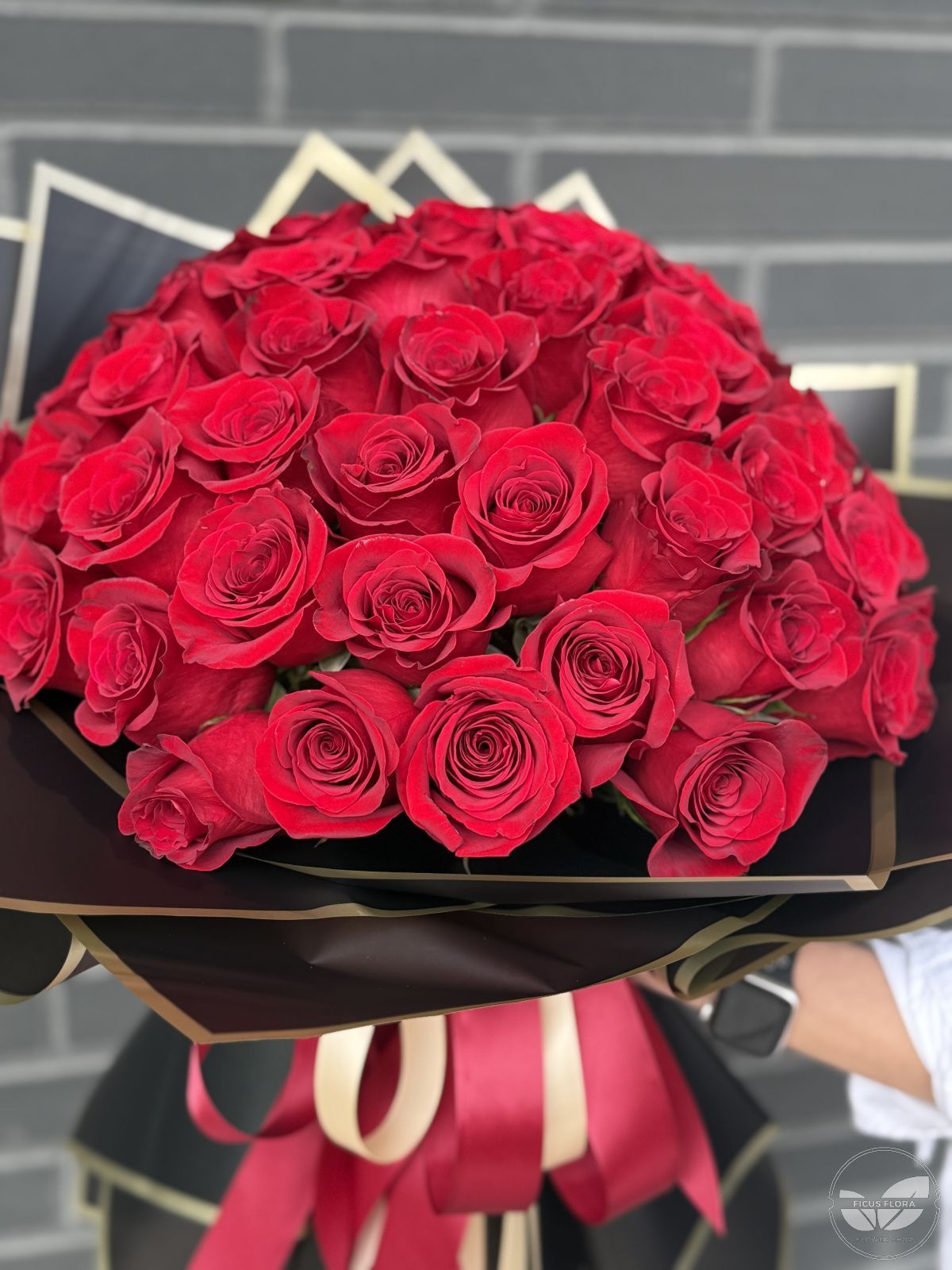 The Grand Passion Red Roses Bouquet is the ultimate symbol of love, romance, and elegance. This luxurious arrangement features dozens of premium, velvety red roses carefully hand-tied and wrapped in chic black paper with golden edges, finished with bold red and cream satin ribbons. A breathtaking bouquet that leaves a lasting impression, perfect for those truly special moments.