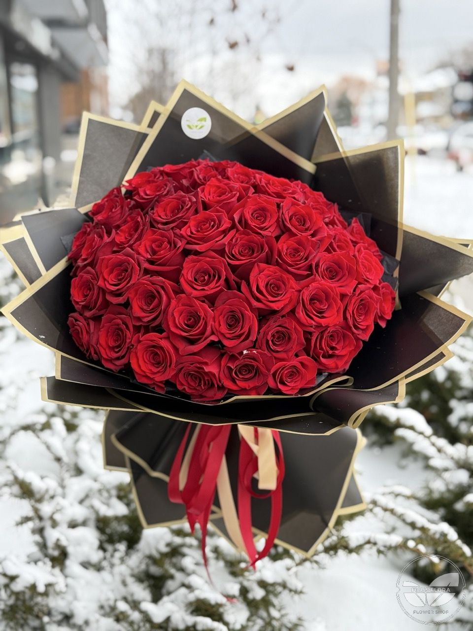 Signature Style: Expertly wrapped in our boutique black and gold waterproof paper, finished with elegant red and cream satin ribbons. This modern, high-end look is a hallmark of Ficus Flora.