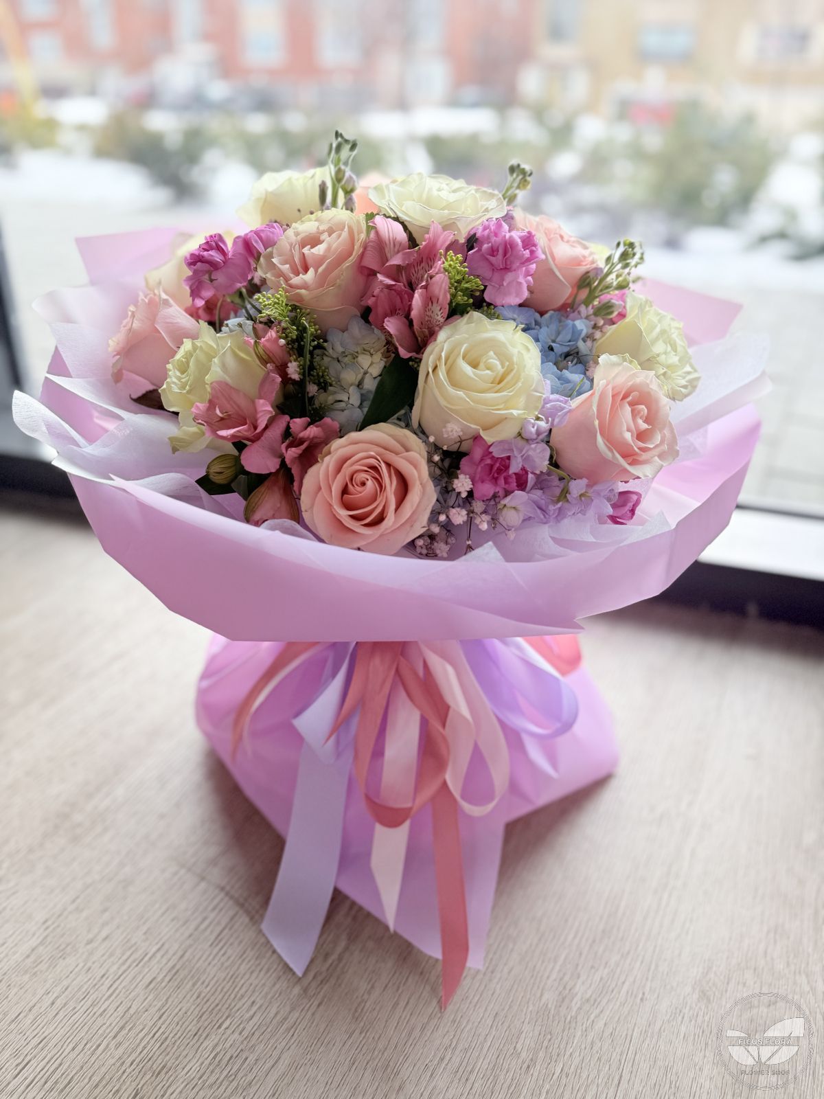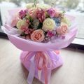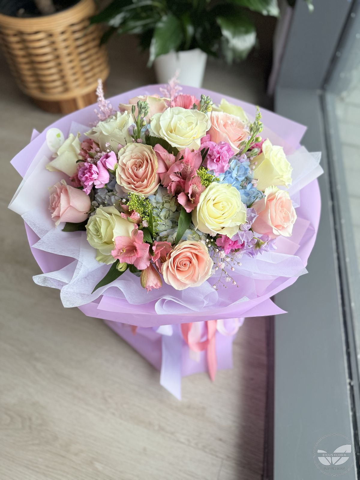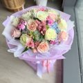 A delicate and romantic composition showcasing lavender and soft peach roses paired with fluffy white and pink carnations. Textured eucalyptus leaves add a modern, earthy touch, all beautifully encased in a layered violet designer wrap. A vibrant and lush arrangement featuring a premium mix of deep pink and pastel gerberas, elegant peach roses, and fragrant lilies. It is accented with white hydrangeas and classic daisies, finished in a luxury gold-trimmed designer wrap with a signature satin ribbon.