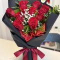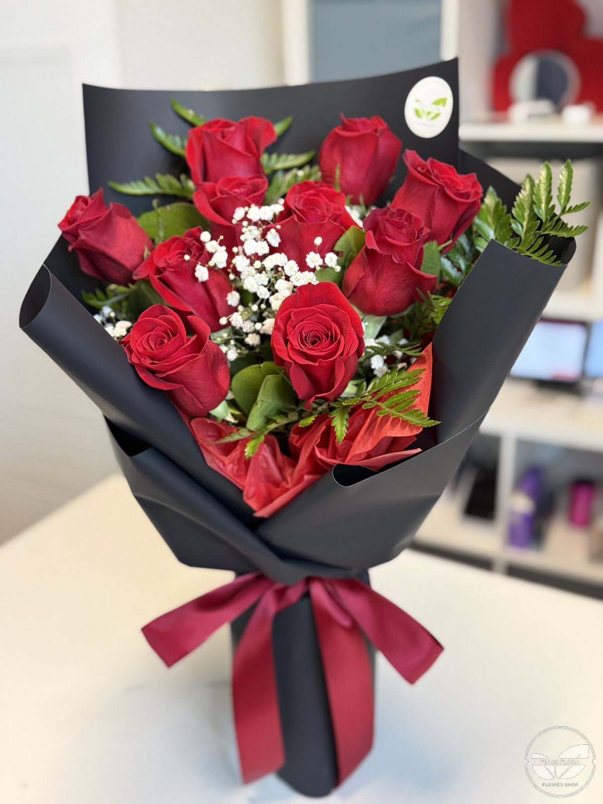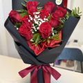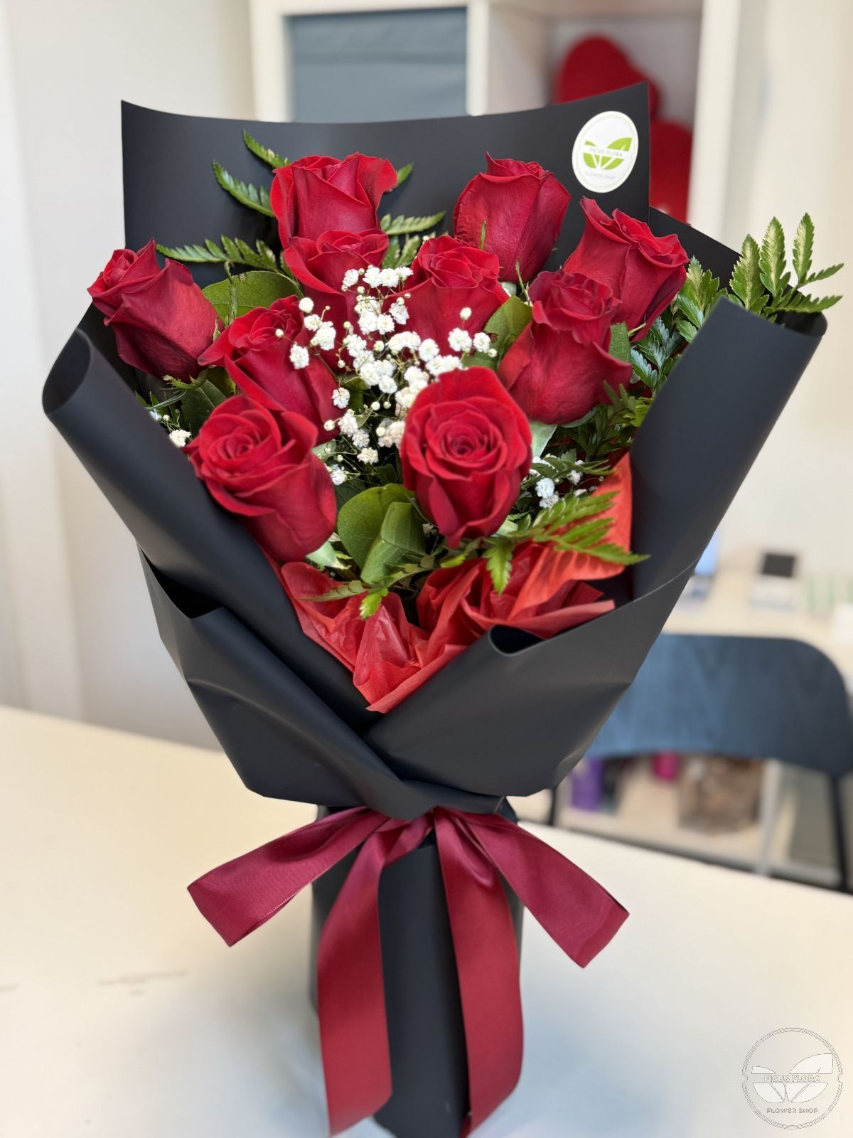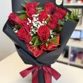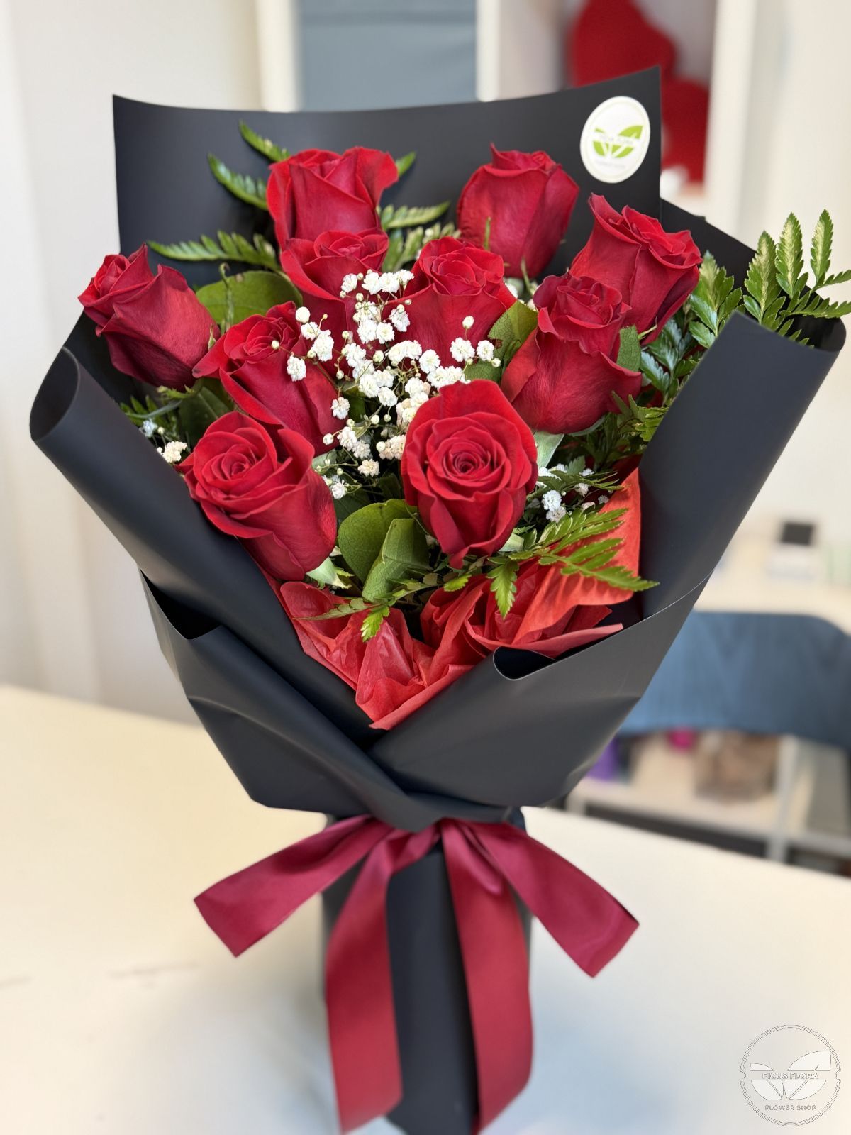 A striking bouquet of 10 fresh red roses wrapped in elegant matte black paper and finished with a bold red ribbon. Symbolizing deep love and passion, this bouquet is a timeless expression of romance — perfect for anniversaries, Valentine’s Day, or any moment you want to say “I love you” in the most classic way.