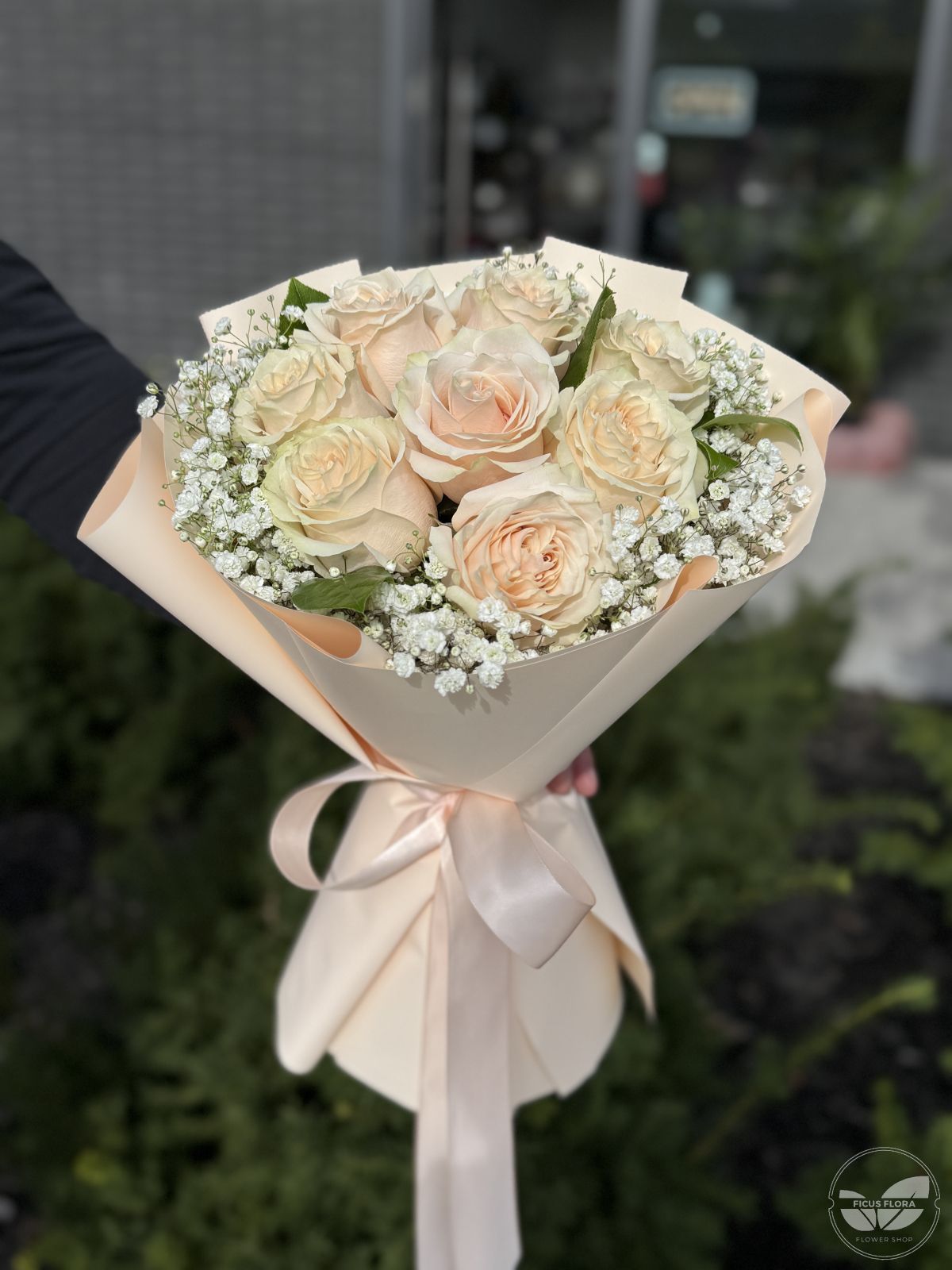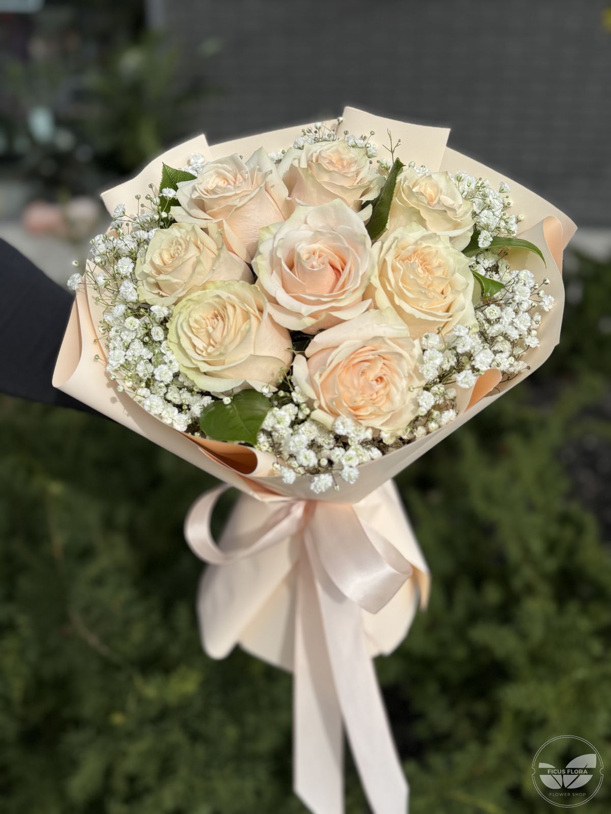 Peach Velvet Roses is a refined and romantic bouquet designed for those who appreciate timeless beauty and soft, warm tones. This arrangement features premium peach roses surrounded by airy baby’s breath (gypsophila) and fresh seasonal greenery, creating a gentle, elegant look suitable for any special moment. Each bouquet is carefully handcrafted at Ficus Flora in Toronto, using only high-quality blooms selected for their freshness, color, and long-lasting charm.