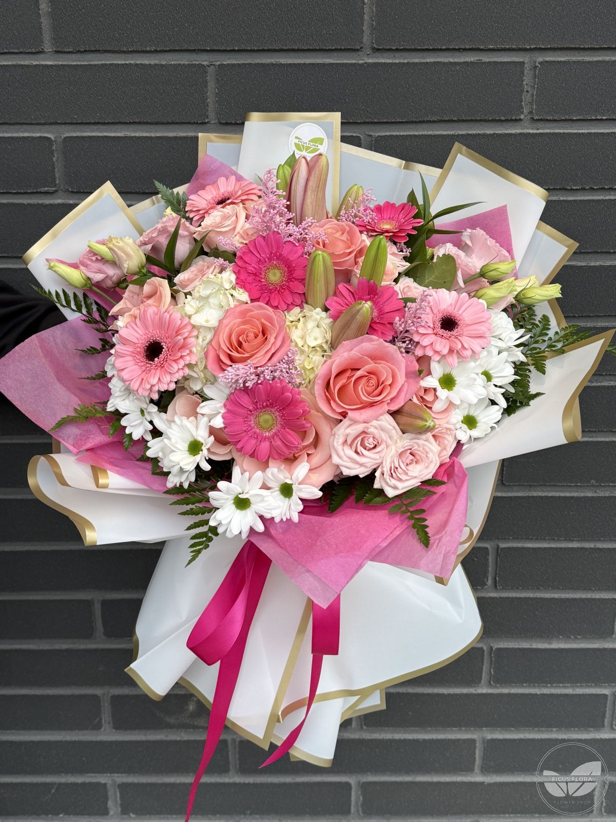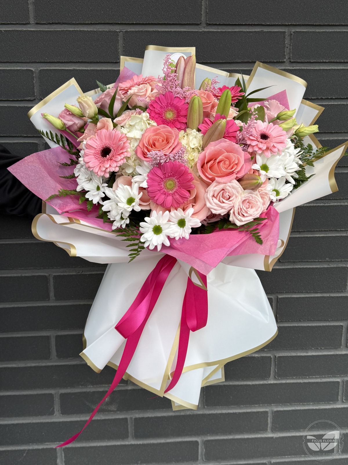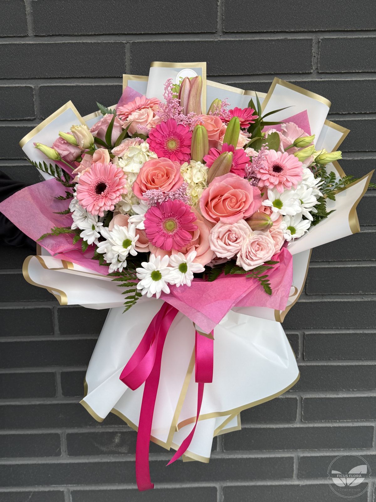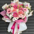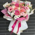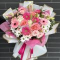 Pink Radiance is an elegant and uplifting bouquet designed to impress at first sight. A harmonious blend of soft pink roses, vibrant pink gerberas, delicate white chrysanthemums, and seasonal accent flowers creates a fresh, radiant composition. Gentle pastel tones combined with brighter pink highlights give this bouquet a romantic yet modern character. Beautifully wrapped with premium paper and finished with a ribbon, Pink Radiance delivers warmth, joy, and refined beauty.