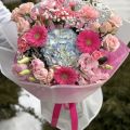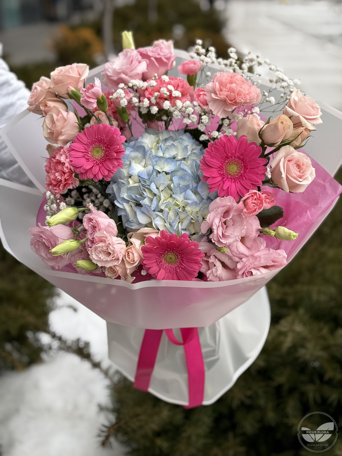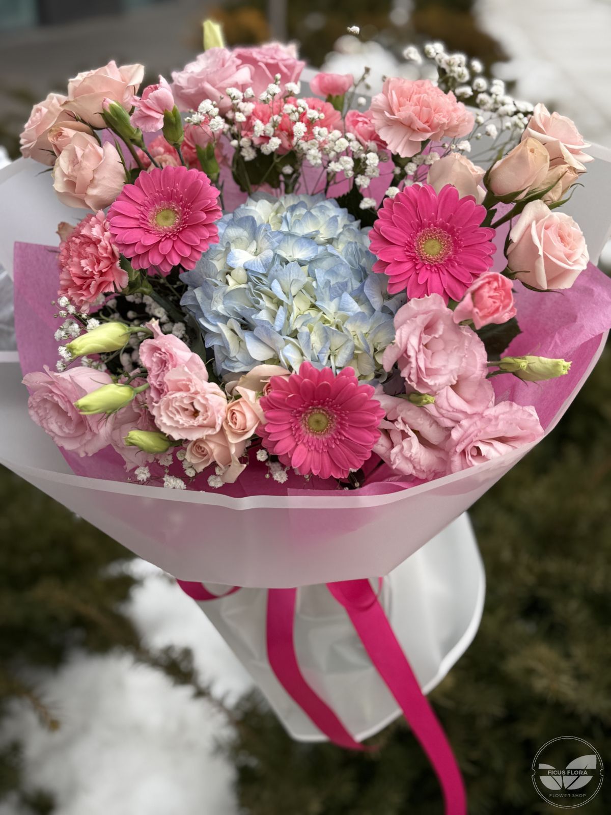 Pink Serenity is a vibrant yet tender bouquet featuring a stunning blue hydrangea at its center, surrounded by bright pink gerbera daisies, soft blush roses, lisianthus, carnations, and delicate baby’s breath. The harmonious blend of bold and pastel tones creates a joyful, fresh, and uplifting arrangement.