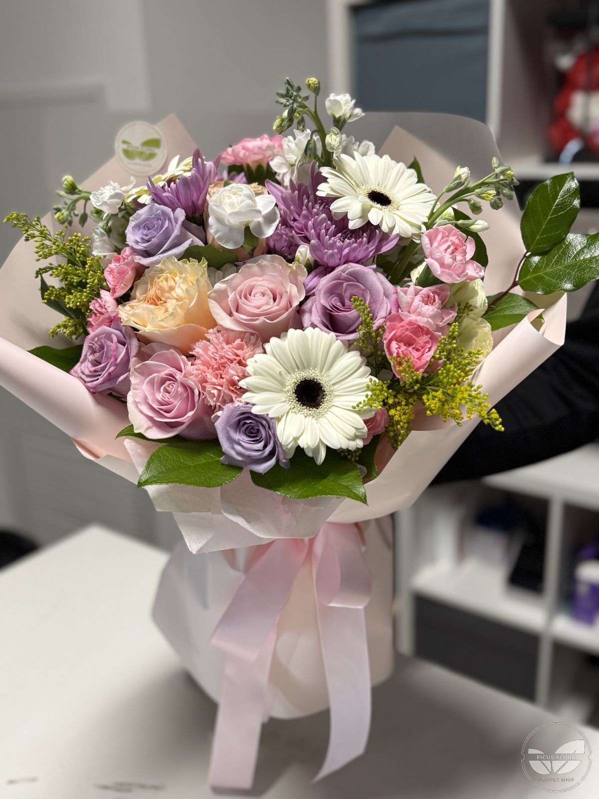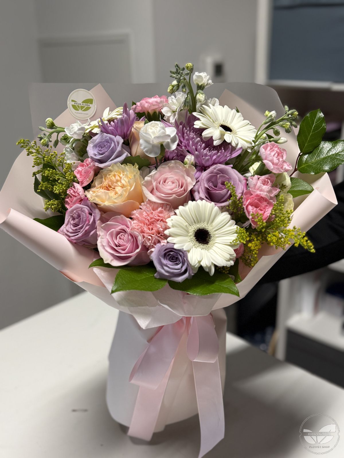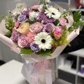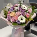 A romantic blend of soft pastels and fresh blooms, this bouquet captures the essence of springtime joy. Featuring elegant roses in pink and lavender tones, white gerberas, peach spray roses, chrysanthemums, and delicate accents of greenery — beautifully wrapped in blush paper and tied with satin ribbons.