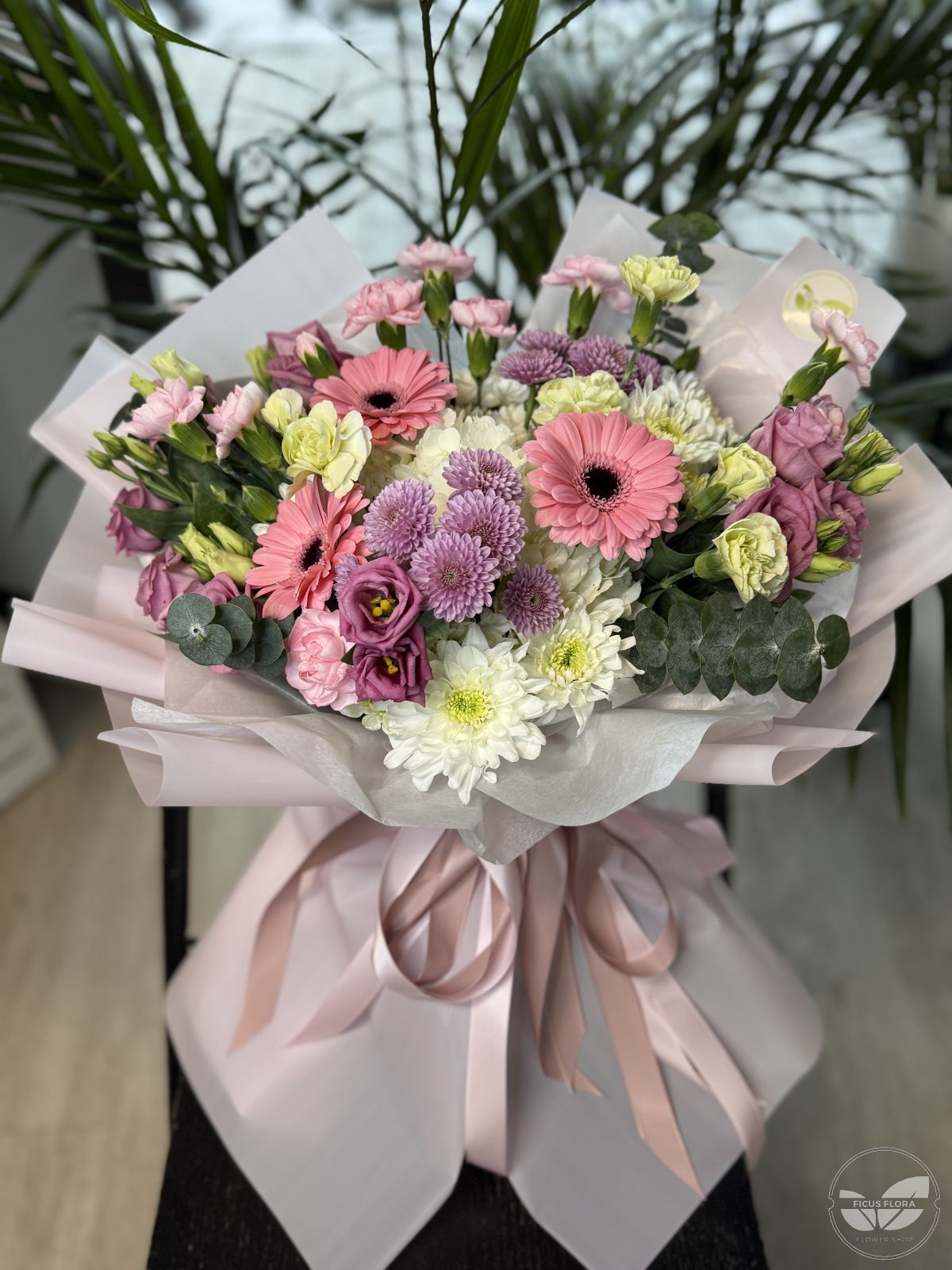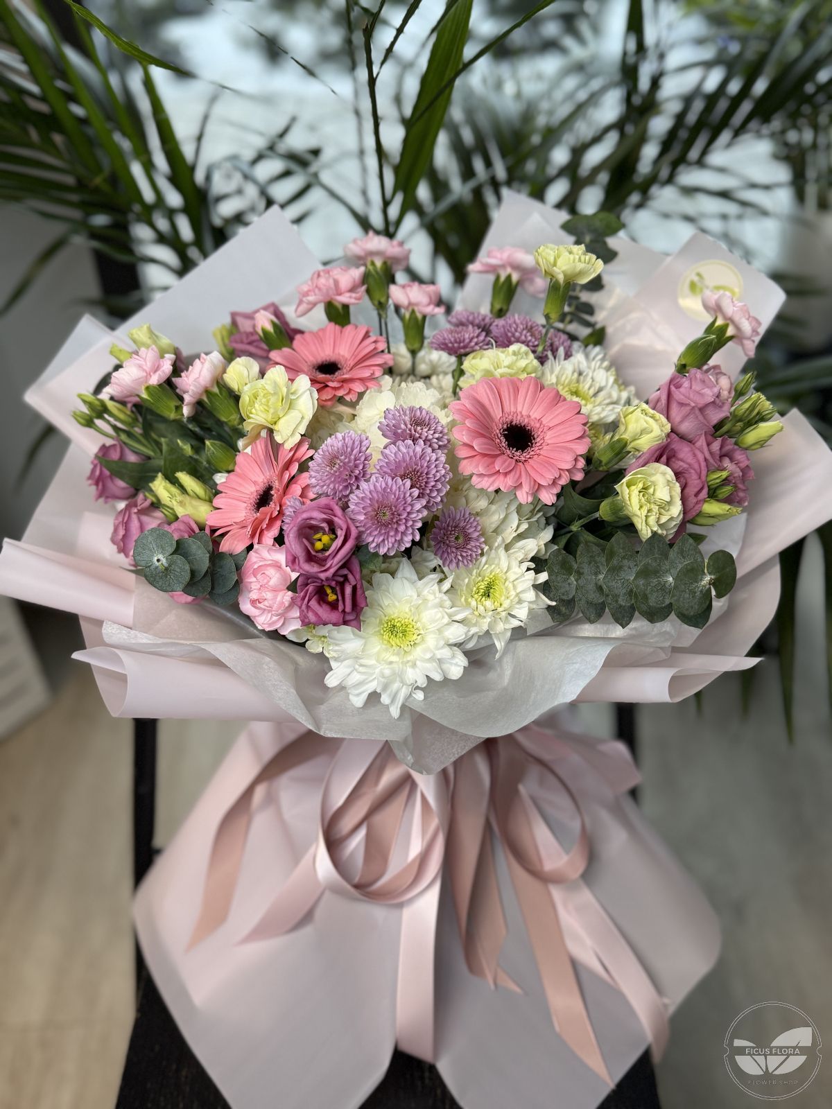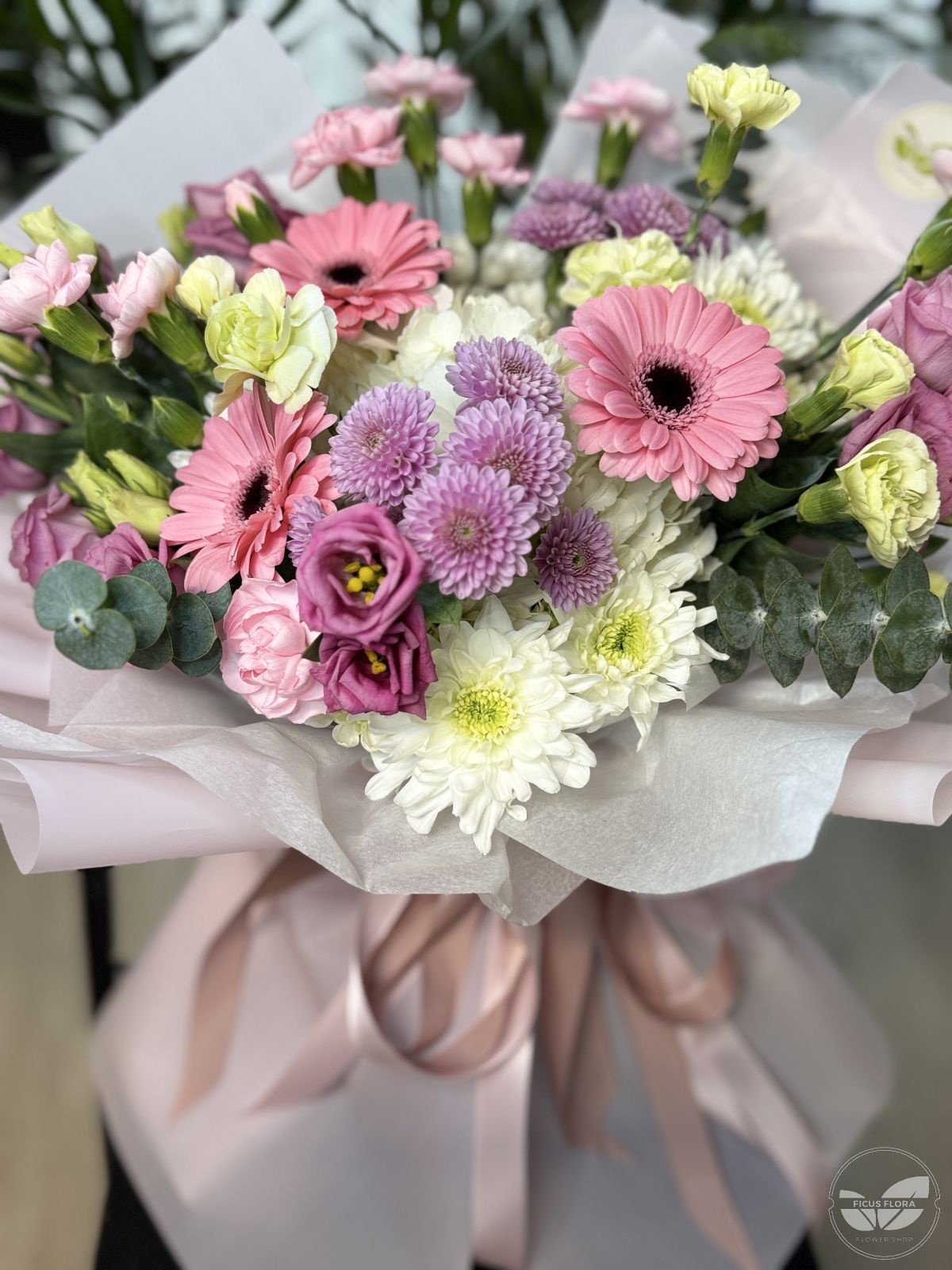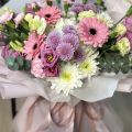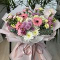 Soft Harmony is a delicate and joyful bouquet featuring a beautiful mix of pastel flowers in soft pink, lavender, cream, and white tones. Pink gerbera daisies take center stage, complemented by lisianthus, chrysanthemums, carnations, eucalyptus, and seasonal greenery. Wrapped in elegant blush and white paper and finished with a soft satin ribbon, this bouquet feels light, fresh, and effortlessly elegant.